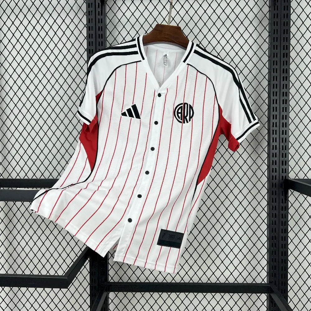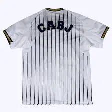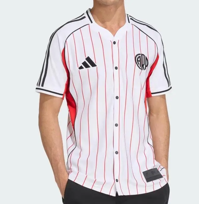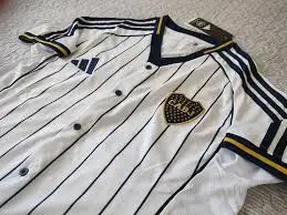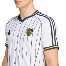 Su cierre con botones y sus llamativas finas rayas son habituales en los estadios de béisbol, mientras que el escudo del equipo añade un toque de pasión por el fútbol.