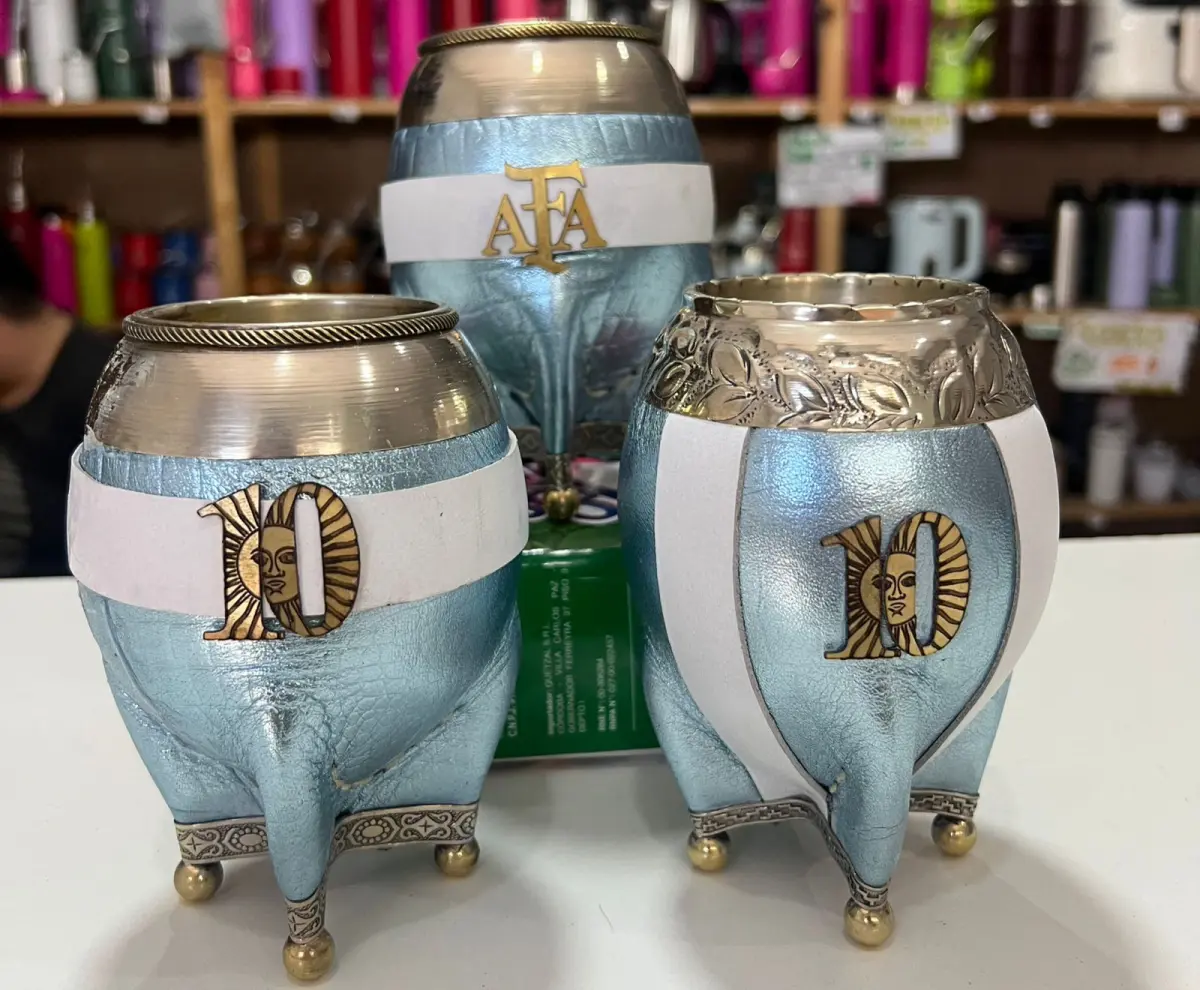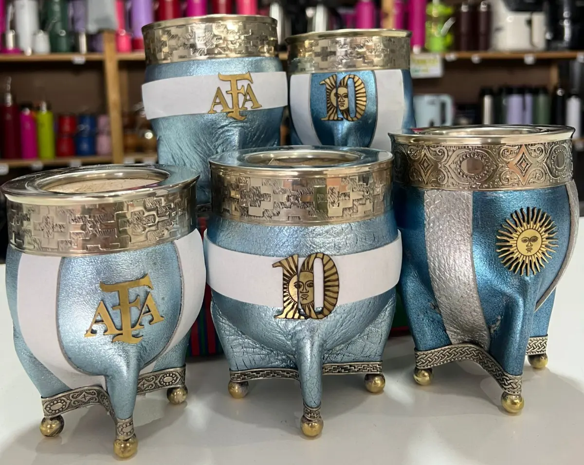 Este mate edición especial mundialista está hecho en calabaza natural, combinando lo mejor de lo artesanal con un diseño imponente inspirado en Argentina campeón. Cada detalle fue pensado para destacar: virola y patas de alpaca que aportan elegancia y resistencia, junto con aplicaciones en bronce que le dan ese toque premium y exclusivo.